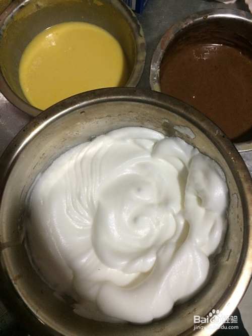 把打发的蛋白分两份,分别拌入两种不同的面糊中,搅拌均匀