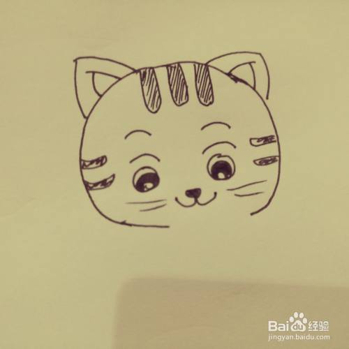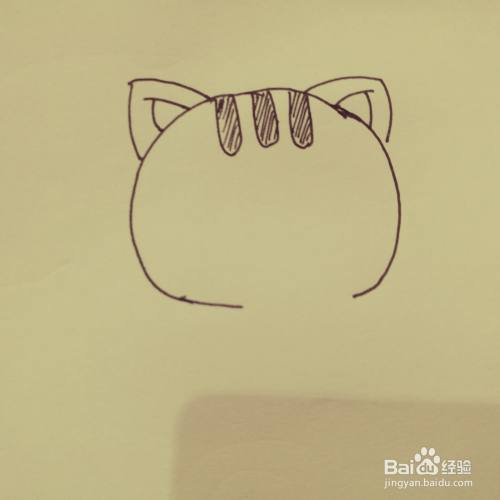 第二步,我们来画卡通小猫咪的两只耳朵,以及头上的猫纹。