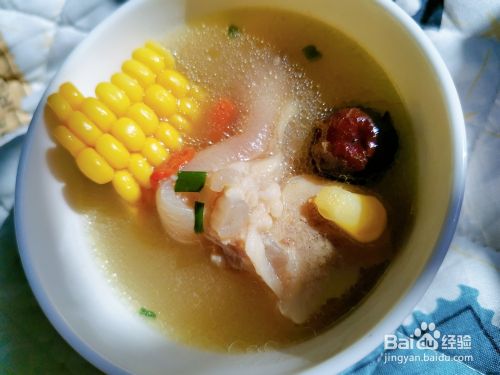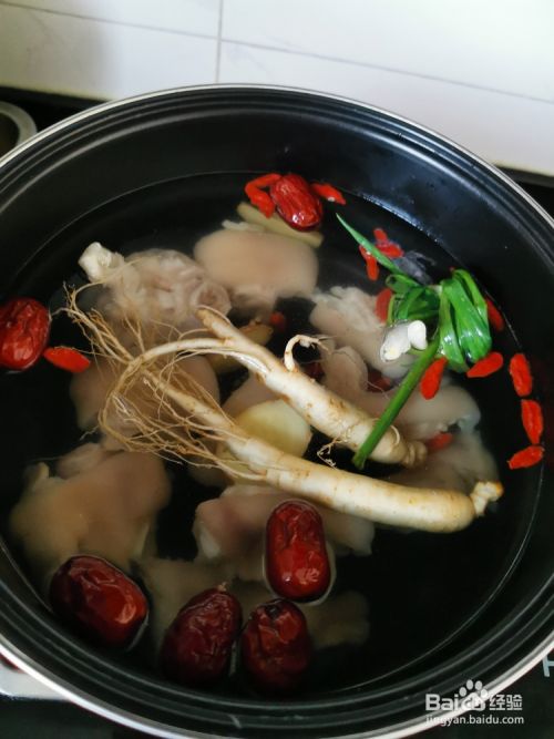 在汤锅里加入足量的开水,放入猪蹄、人参、红枣、枸杞、葱、姜,盖上锅盖,用高热煮沸,然后放入玉米,煮沸,改用低热,煮1-1.5小时,直到猪蹄软烂,开高热,加点盐和白胡椒调味,加入一些葱,关火??.