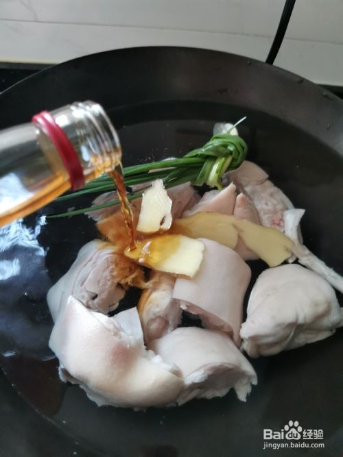猪蹄切碎,清水浸泡1小时,去血,锅中放入冷水,加入姜、葱两片,料酒热烫,开水后捞出,用温水洗净,去杂质备用