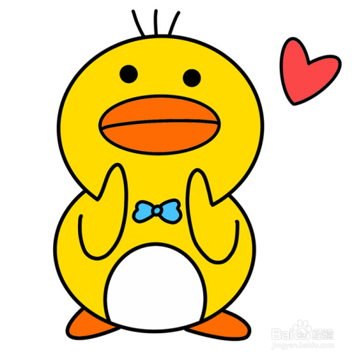最后,上色。给小黄鸭的身子涂上黄色,嘴巴和脚涂红色,还有红色爱心,领结涂成蓝色,肚皮就保留白色。这样,可爱鸭简笔画就画好了。