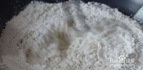 2、在面粉里加入3g糖与1g盐,搅拌均匀,盐和糖能够帮助酵母发酵的更好。然后我们用温水冲酵母,搅拌均匀,缓慢的加入到面粉里。搅拌均匀。