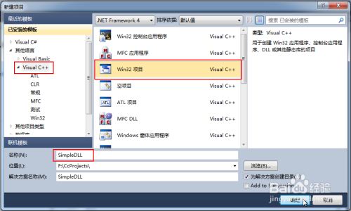 选择Visual c++》Win32 项目》输入项目名称,选择保存目录,单击“确定”按钮