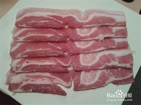将五花肉切片,一般的话尽量切得薄一点,切太厚容易显得油腻。