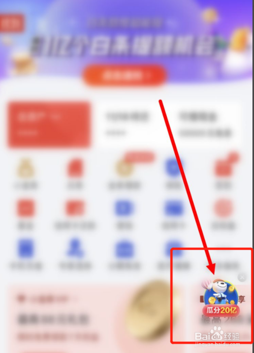 1、打开京东金融,在首页界面,选择点击【瓜分20亿】选项。