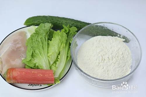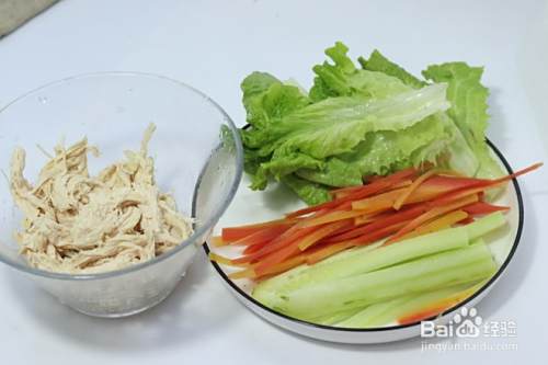 鸡肉手撕成小长条,黄瓜和胡萝卜切丝。
