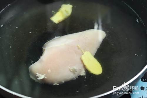 鸡胸肉放入水中,加姜片和料酒煮熟。