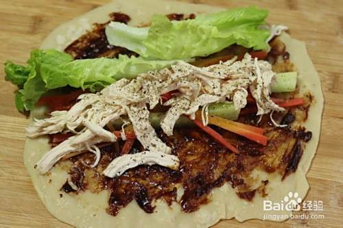 煎熟后,涂抹黄豆酱和甜面酱,放上胡萝卜,黄瓜,生菜和鸡肉丝,撒上黑胡椒粉。