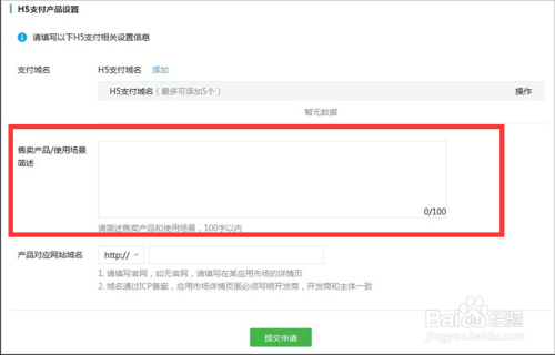 2,售卖产品/使用场景:此处需要填写一项需要开通微信支付H5支付企业或者个体户的营业范围。