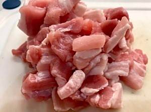 五花肉切成5毫米厚左右的薄片。可以把肉放在冰箱里稍微冻一下,这样会比较好切。
