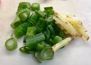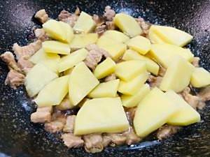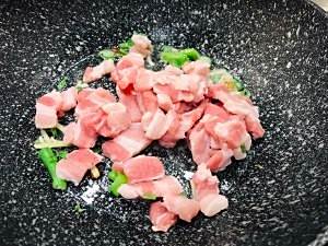 锅内下油烧至七分热,加入葱花,姜丝和一个八角,炒出香味。加入肉片,炒至白色。