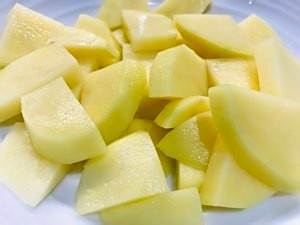 土豆切成8毫米厚的土豆片。切好之后放在凉水里面备用,这一步的目的是防止土豆当中的酚类物质发生褐变。