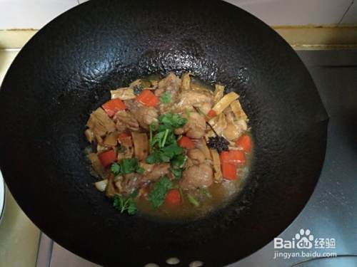 汤汁沸腾后转为小火慢慢炖,将笋干炖软,临出锅时放入少量香菜即可