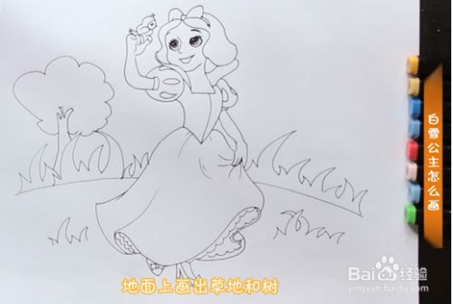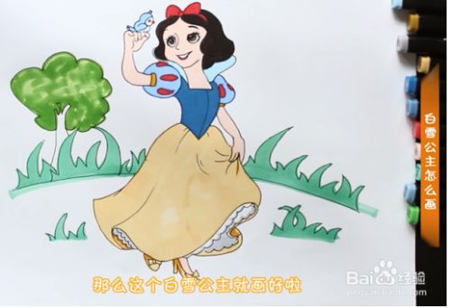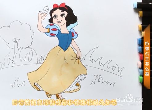 裙内用银色涂,小鸟用蓝色黄色涂,再用绿色涂草、青色和褐色涂树叶和树干,那么这个白雪公主就画好啦