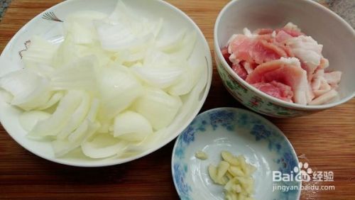 白洋葱洗净切片,腿肉也可以换成五花肉,蒜头切末备用。