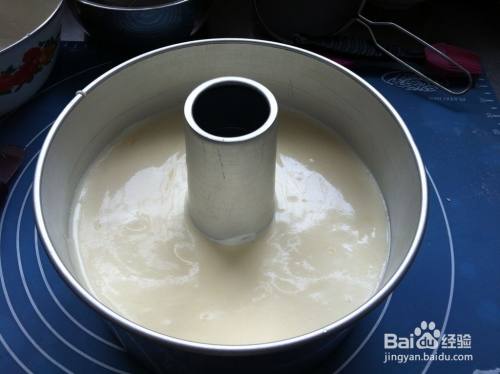 将面糊倒入模具中。怕18cm小黄不足以承担多加了这么多水分的大任,所以用了三能八寸模具,但感觉面糊有点少。