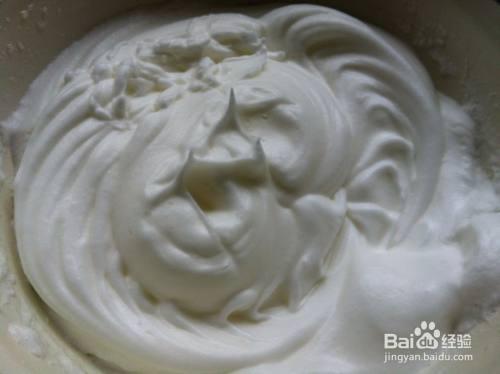 打蛋白。 先将蛋白打到起泡,加入塔塔粉(如果你加)继续搅打,我加了几滴柠檬汁,直到提起打蛋头后蛋白能形成柔软的尖角,加入其余糖份(我用30g),打到缓慢提起打蛋头能够形成硬挺的尖角。 书中说,细的糖可以使蛋白更膨松和稳定,下次我试试自己打的糖粉。