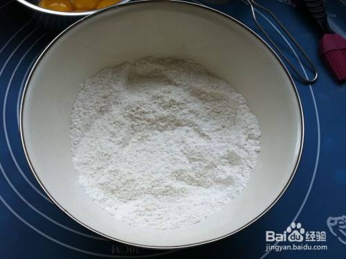 书中蛋黄糊的拌合与我们平时也不同。 先将粉类和大部分糖(我放了90g)在大碗中搅拌均匀。