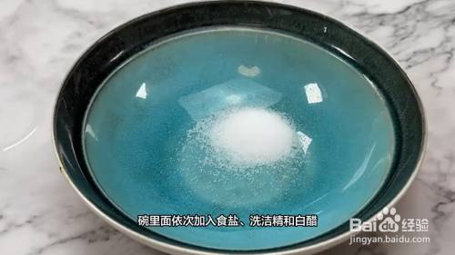 准备一个碗,碗里面依次加入食盐、洗洁精和白醋,用温水把它们稀释。