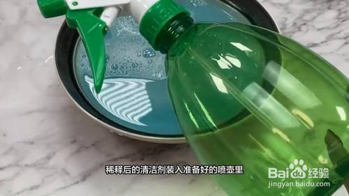 稀释后的清洁剂装入准备好的喷壶里,均匀的喷洒在油烟机上。