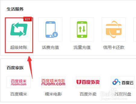 3.点击下车菜单栏中“生活服务”里的第一个“超级转账”进入(看下图3)