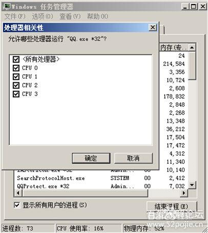 大部分程序进程,默认是支持多核的,上面四个核,取消两个,这样在再直播游戏就不卡了(如果是双核,就只用一个核去处理直播软件)