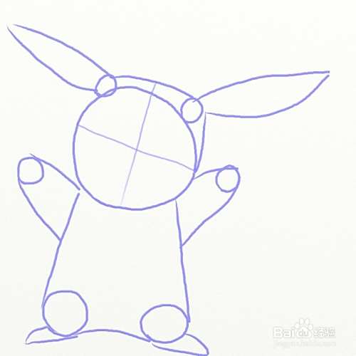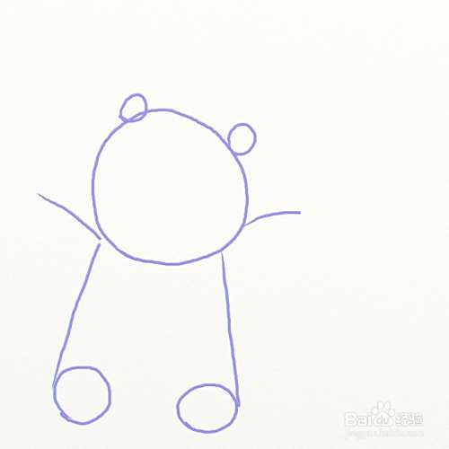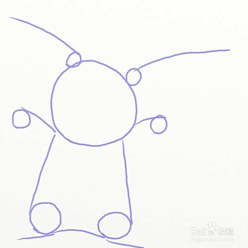 在腿的线的末端画两个小圆圈。在头部的耳朵再次画两个小圆圈,并绘制两个水平线的手。
