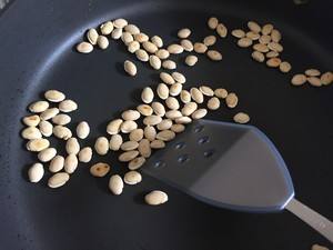 扁豆洗净,放锅里翻炒至两面金黄色,这样可以去除豆腥味。