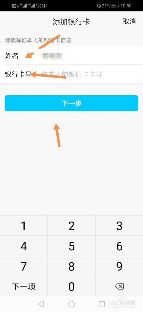 输入要绑定的银行卡用户姓名(开户姓名),输入银行卡号,点击下一步