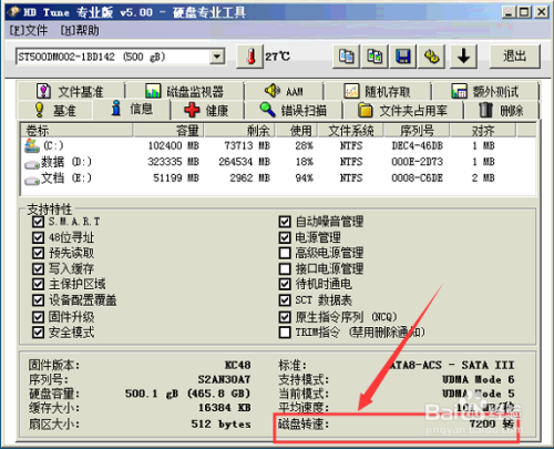 第一种方法:直接查看硬盘表面上的标贴获取转速信息,如下图所标的是7200转每分钟。