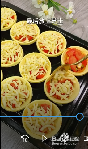 然后放入火腿丁 豌豆粒 玉米粒等最后放上芝士;