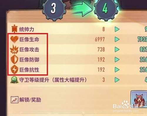 第一步,升级巨像。家园解锁巨像之后,可以升级巨像,巨像种类有:尖刺巨像,激光巨强和愤怒巨像,提升巨像的统率力、生命值、攻击、防御、抗性、以及守卫最大等级,提升巨像等级还能解锁一些新兵种;