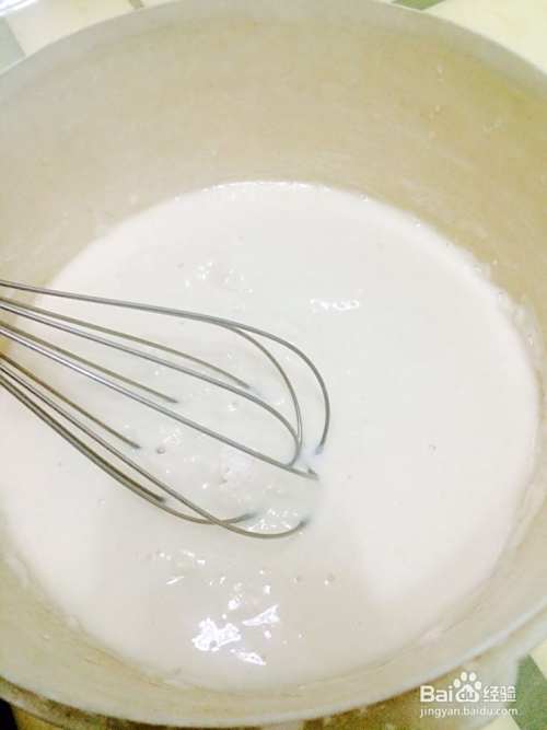 加入水、搅匀无颗粒、面糊要提起搅拌棒就可以快速流下的程度。