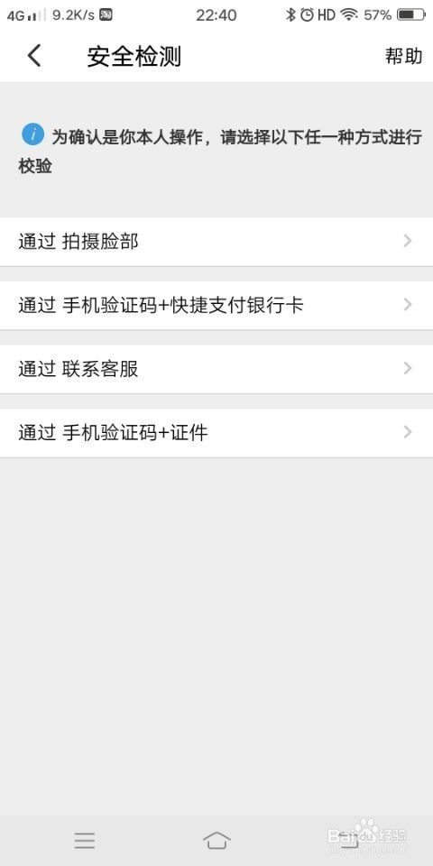 向右滑动完成安全验证,进入到安全检测页面,在页面上可以选择通过拍摄脸部、通过手机验证码+快捷支付银行卡、通过联系客服、通过手机验证码+证件等四种方式进行校验。