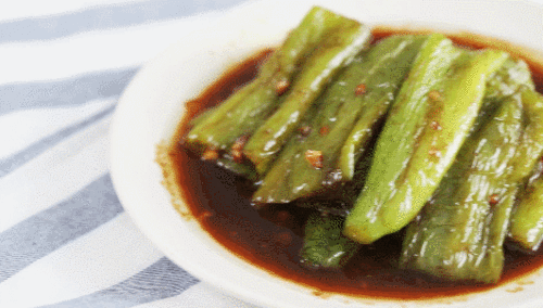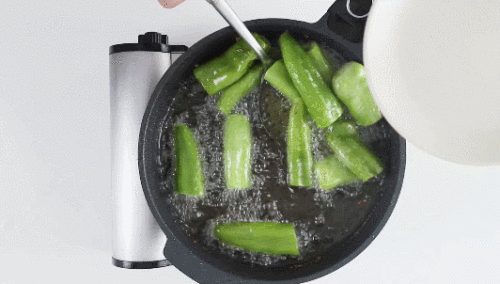 锅中加500ml豆油,大火烧至7成热,转中火下入尖椒炸1分钟至表面发皱后捞出(大火3分钟→中火 1分钟)