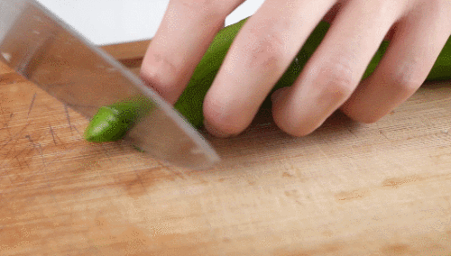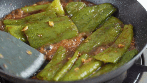 中火热锅至掌心灼热感,入豆油10ml,加蒜末炒香,倒入料汁搅拌均匀,然后下青椒炒均匀即可(中火1分钟)