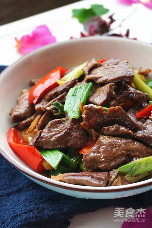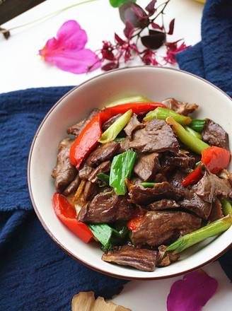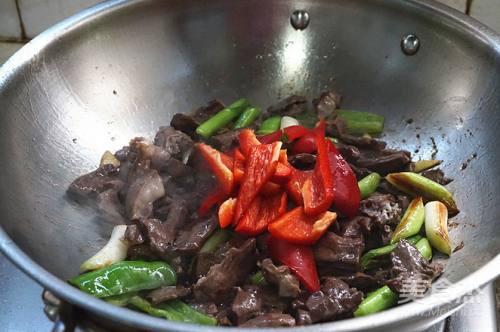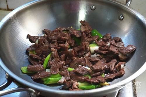 3炒锅将食油烧热,然后倒入猪心片煸炒至转色,就可以捞起来