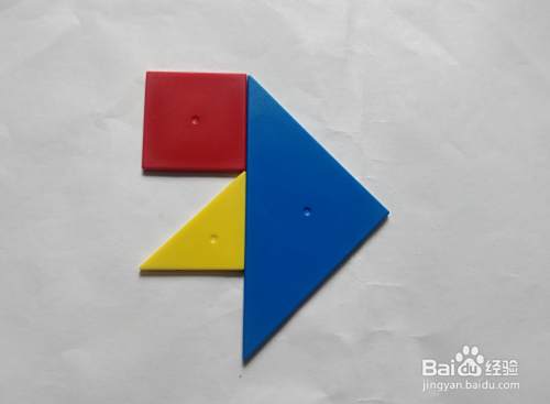 在正方形右侧,放上蓝色三角形挨着,上端一齐,如图。