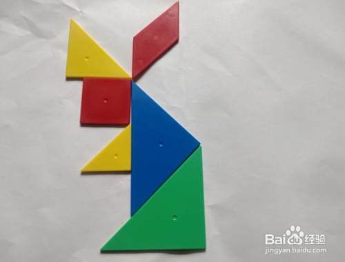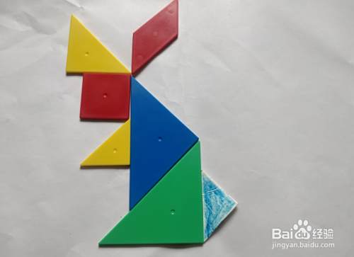 在绿色三角形右侧,放上蓝色小三角形挨着,直角向右,如图。