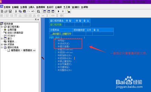查看使用的模块信息,双击窗口进入代码编辑区,一般简单的网页访问我们只需要填写前三项参数。