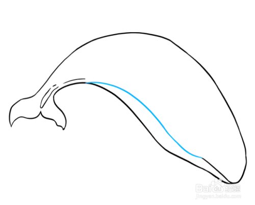 勾勒出鲸鱼的脸、肚子和尾巴。然后,在鲸鱼头顶附近画一条较短的线,形成嘴。