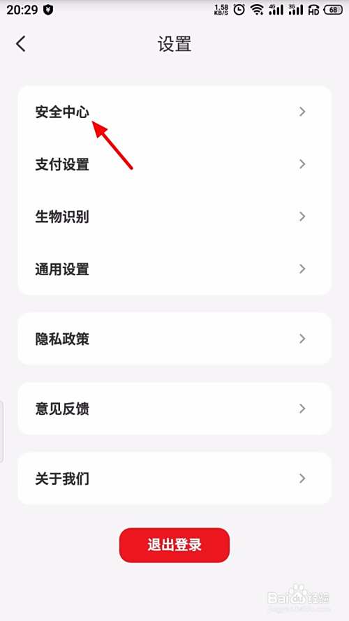 在设置页面,点击 安全中心;