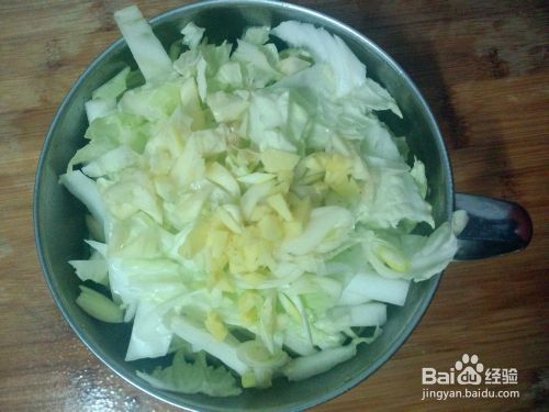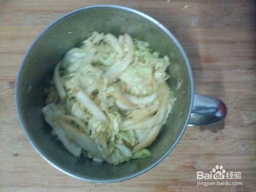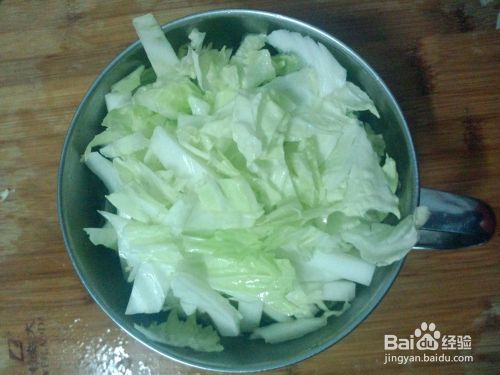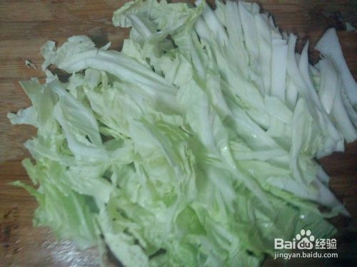 将白菜叶洗净,菜梗切成段,菜叶切成条。