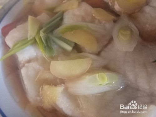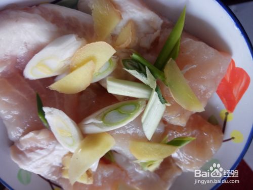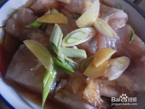 将葱剥好,冲洗干净,切成斜短段;将姜洗干净,切成薄姜片;然后均匀地洒在鱼盘上。