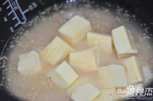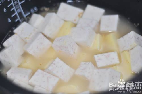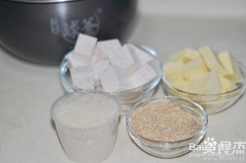 1准备材料。荔浦芋头切成小块,红薯去皮切小块。