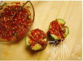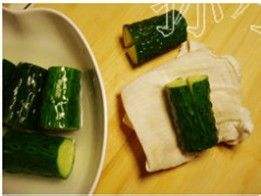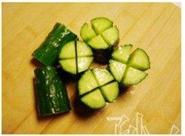 黄瓜洗净,切成5CM长的段,竖起,在上面切十字,不要切到底。