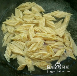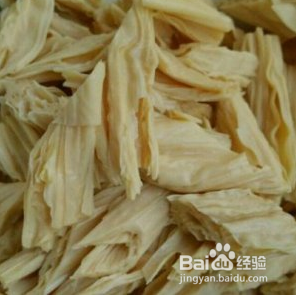 将买回来的腐竹进行简单的加工,就是用剪刀进行裁剪,因为买回来的腐竹比较长,剪短一些比较有利于加工。