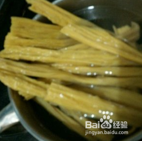 锅中放入大量的水,并放入少量的盐,把水烧开放入腐竹。