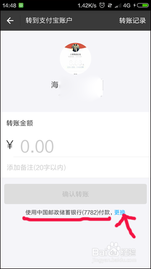 出来转账页面,先不要着急输入转账金额,关注一下最底下的那行字,这个是默认的转账方式。如果不想用这张卡转账想换其他方式,点击一下切换按钮。