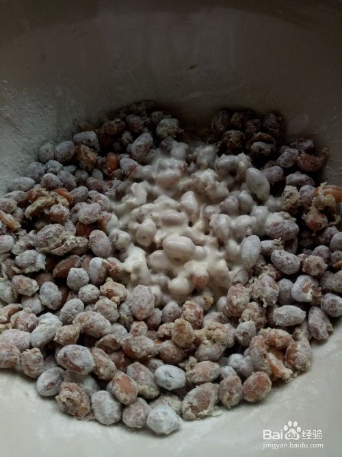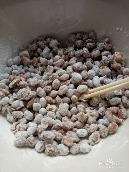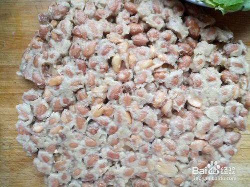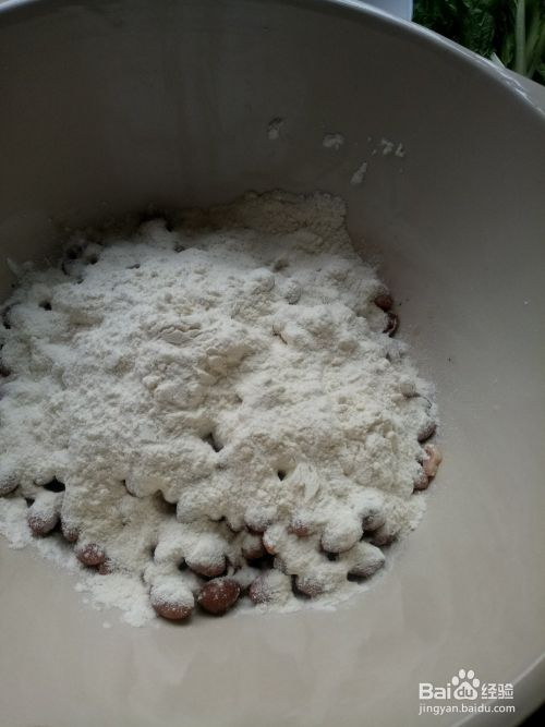 在另一个碗里倒入面粉,加水后搅匀,然后倒入盛有花生得盆里搅匀。